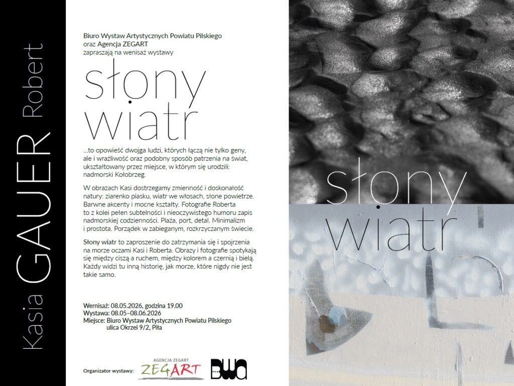 Słony wiatr to zaproszenie do zatrzymania się i spojrzenia na morze oczami Kasi i Roberta. Obrazy i fotografie spotykają się między ciszą a ruchem, między kolorem a czernią i bielą. Każdy widzi tu inną historię, jak morze, które nigdy nie jest takie samo.