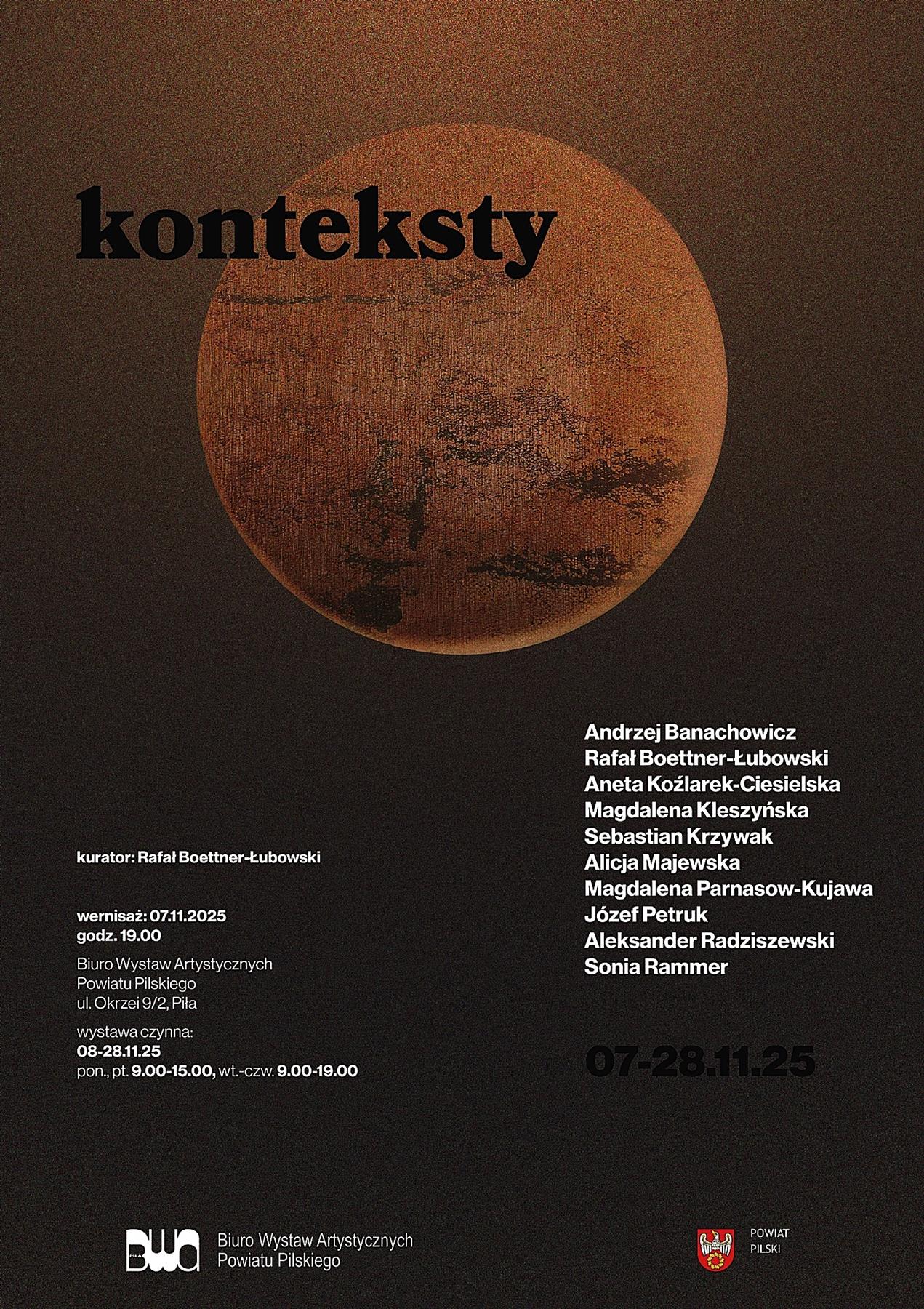Wystawa „KONTEKSTY” to zaproszenie do wielogłosowego dialogu pomiędzy różnorodnymi postawami twórczymi, autorów i autorek reprezentującymi odmienne pokolenia, stylistyki oraz dyscypliny współczesnych sztuk wizualnych. Projekt ten nie opiera się na sztywno zdefiniowanej tezie kuratorskiej ani rygorystycznie sprecyzowanym ideologicznym założeniu. Jego głównym celem jest stworzenie przestrzeni dla swobodnego i wieloznacznego przepływu znaczeń i emocji, które pojawiają się w relacjach między prezentowanymi dziełami. Zderzenie różnych języków artystycznych otwiera przed widzami nowe konteksty – zarówno formalne, jak i treściowe – jednocześnie pozwalając dostrzec indywidualne ścieżki twórcze i intencje zaproszonych artystek i artystów. Wśród uczestników wystawy znajdują się wybitni przedstawiciele polskiej sceny artystycznej. Prof. Andrzej Banachowicz prezentuje zarówno monumentalne tkaniny unikatowe, jak i obrazy cyfrowe powstałe na bazie własnych, wcześniejszych prac tkaninowych. W dialog z jego twórczością w interesujący sposób wchodzą kolaże Magdaleny Kleszyńskiej wykorzystujące haft na nietypowym, metalowym podłożu. Fotografia, animacja, grafika cyfrowa oraz formy przestrzenne stają się polem eksploracji dla Rafała Boettnera-Łubowskiego, Aleksandra Radziszewskiego i Anety Koźlarek-Ciesielskiej. Nietypowe i zaskakujące potraktowanie artefaktu abstrakcyjnego możemy natomiast odnaleźć w malarswie Sebastiana Krzywaka oraz w eksperymentalnych dziełach Magdaleny Parnasow-Kujawy, w których wykorzystywane zostały tak nietypowe elementy, jak produkowane współcześnie soczewki. Wymiar eksperymentalny reprezentują też z całą pewnością na wystawie„KONTEKSTY”: realizacja prof. Alicji Majewskiej z serii „Prace domowe” (w której tworzywem obiektu przestrzennego stają się między innymi autentyczne fragmenty „zacytowanego” przez autorkę mebla) oraz prace Sonii Rammer z cyklu „Kroniki islandzkie” (będące „zapisami” jednej z wielu podróży stanowiących dla artystki doświadczenie bazowe dla całej jej twórczości). Istotnym dopełnieniem wystawy są rzeźby, reliefy oraz malarstwo prof. Józefa Petruka. Szczególne znaczenie mają tu kameralne płaskorzeźby z lat siedemdziesiątych ubiegłego wieku, prezentowane publicznie po raz pierwszy. Z kolei pokazany na wystawie obraz malarski prof. Petruka ukazuje mniej znane oblicze twórczości tego zasłużonego dla poznańskiego środowiska artysty. Wystawa „KONTEKSTY” to przestrzeń spotkania, różnorodności i refleksji – gdzie każda praca funkcjonuje zarówno indywidualnie, jak i w dialogu z innymi, prowokując do odkrywania nowych znaczeń i perspektyw.