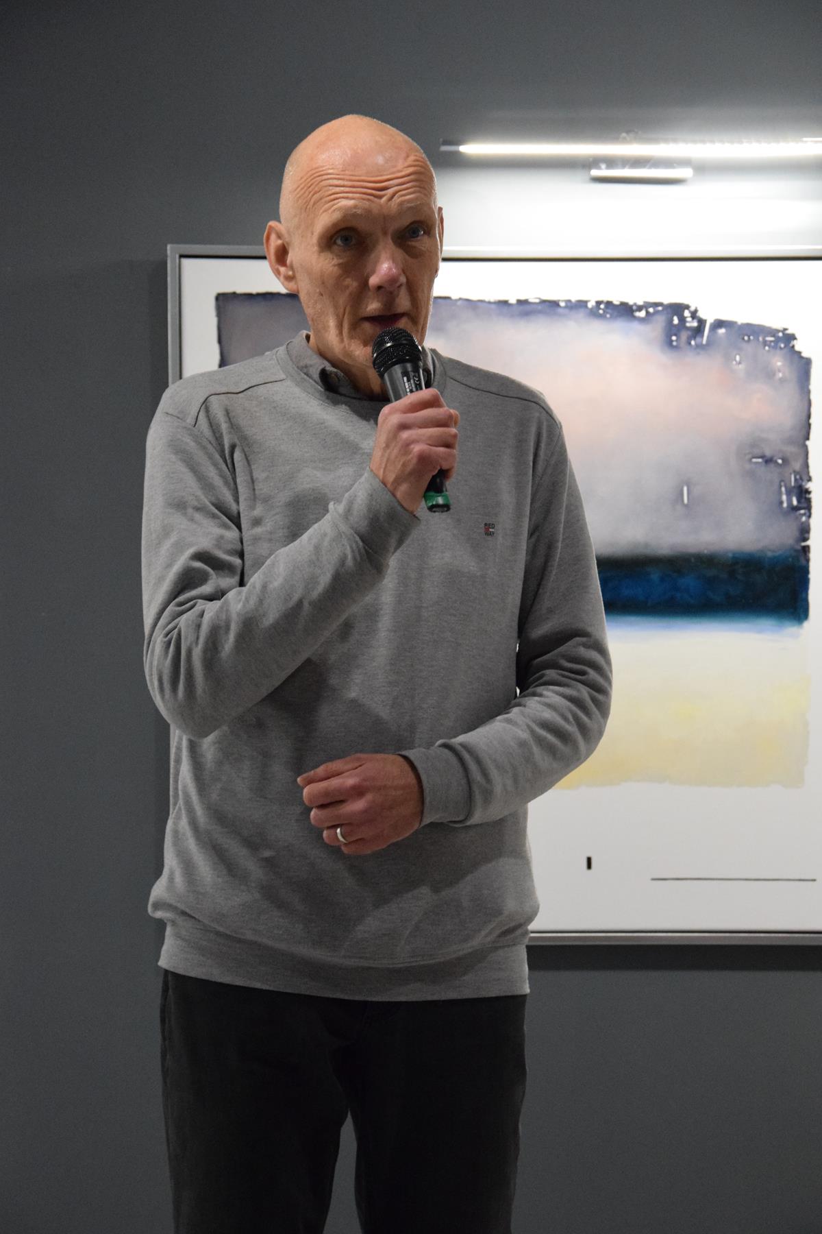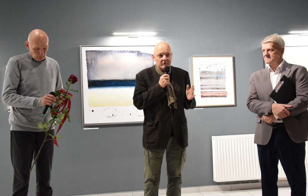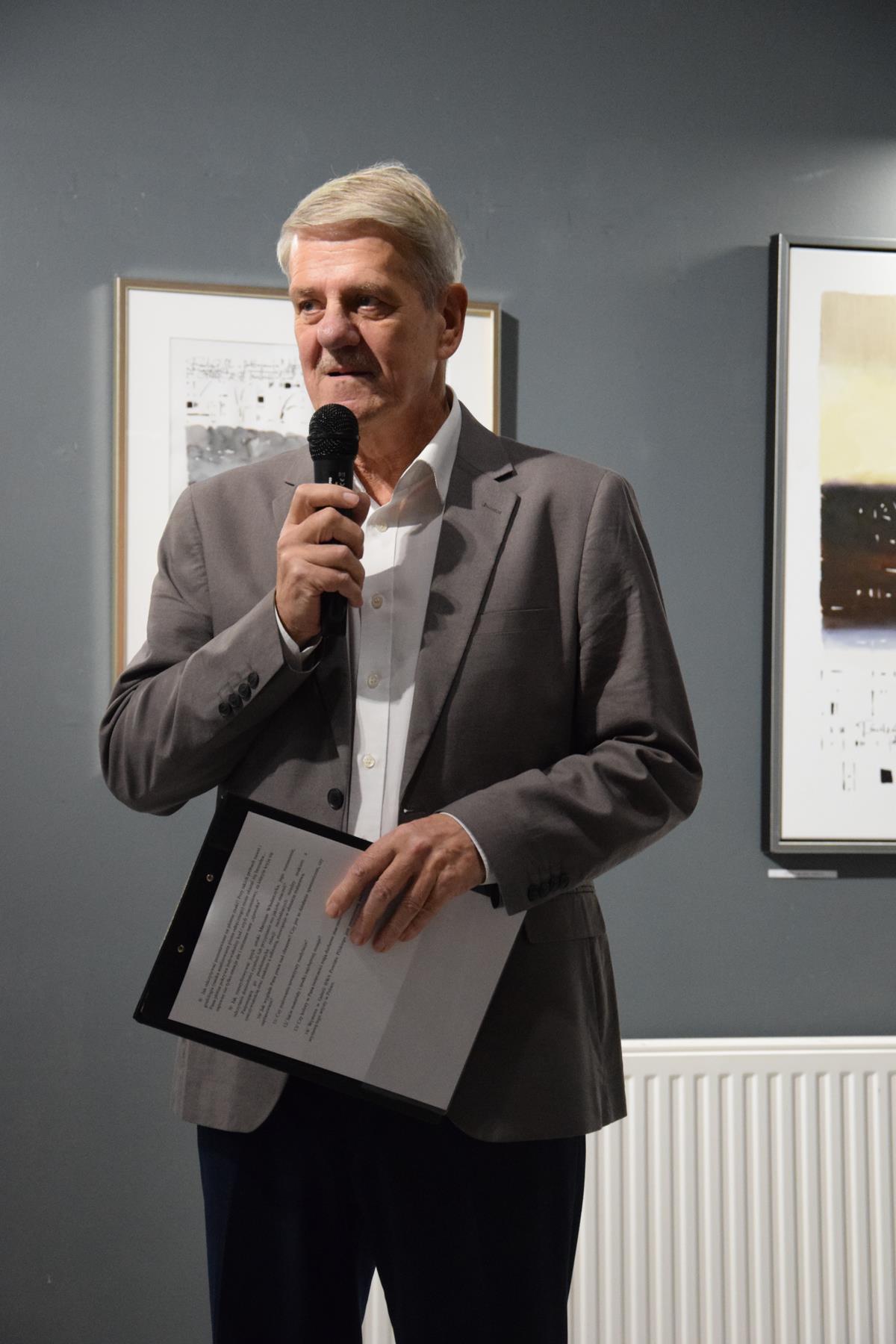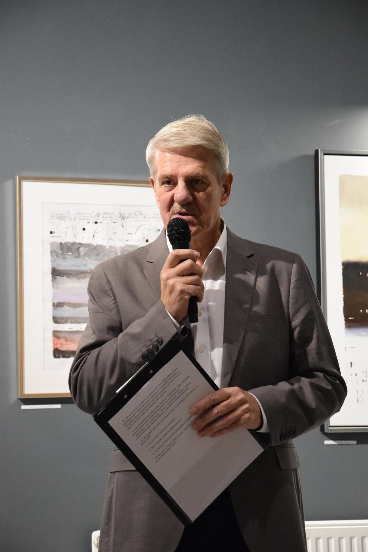 Głos podczas wernisażu zabrał także prof. Jacek Ojrzanowski, który podziękował zebranym za przybycie, dyrektorowi i pracownikom Galerii za promowanie sztuki Mariusza Włodarczyka oraz za piękną aranżację wystawy.