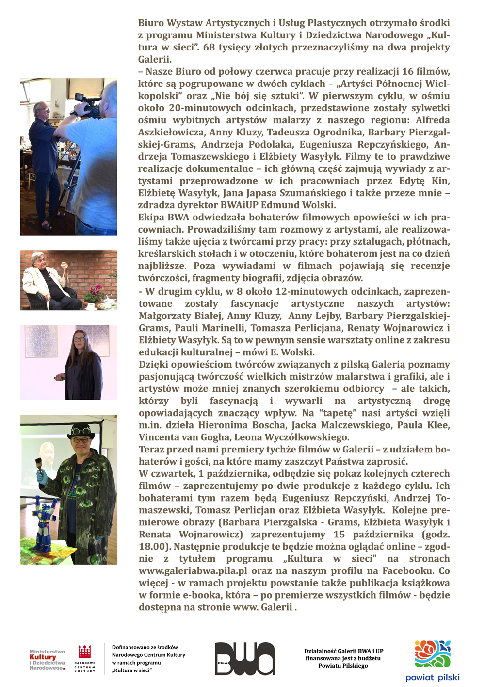 Zapraszamy na kolejne prapremiery filmów zrealizowanych przez BWA i UP w ramach programu „Kultura w sieci”. Uwaga! Prosimy o stosowanie się do zaleceń w związku z COVID-19.